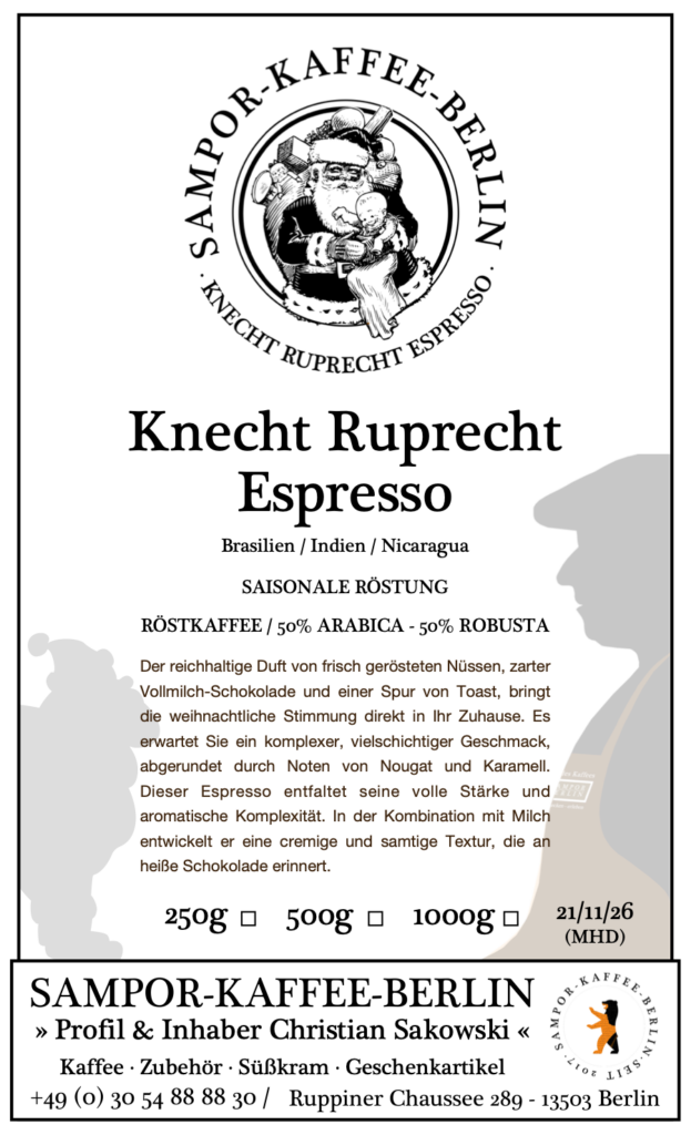 Die Kaffeeröstungen werden im SAMPOR-KAFFEE-BERLIN als ganze Bohne in 250g, 500g und 1000g abgefüllt. Auf Wunsch können die Bohnen auch ohne Aufpreis, frisch und für die entsprechende Zubereitungsmethode (von Espresso bis French Press) gemahlen werden. Eine Mokkavermahlung ist NICHT möglich.