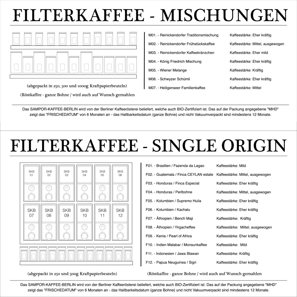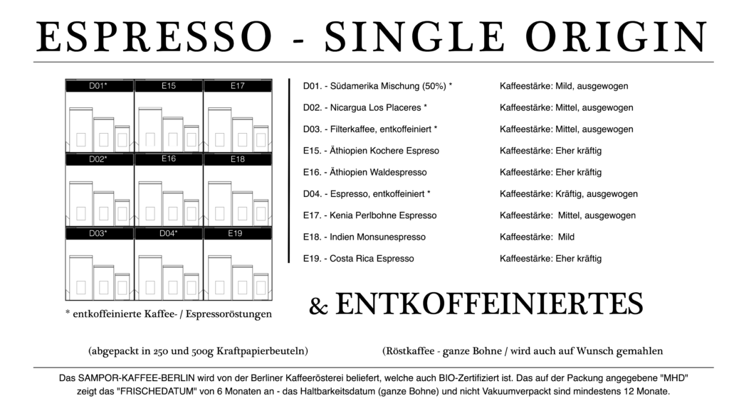 Ein Auszug des Warenangebots im SAMPOR-KAFFEE-BERLIN. KEINE WERBUNG. Die Preise erfahren Sie im Laden