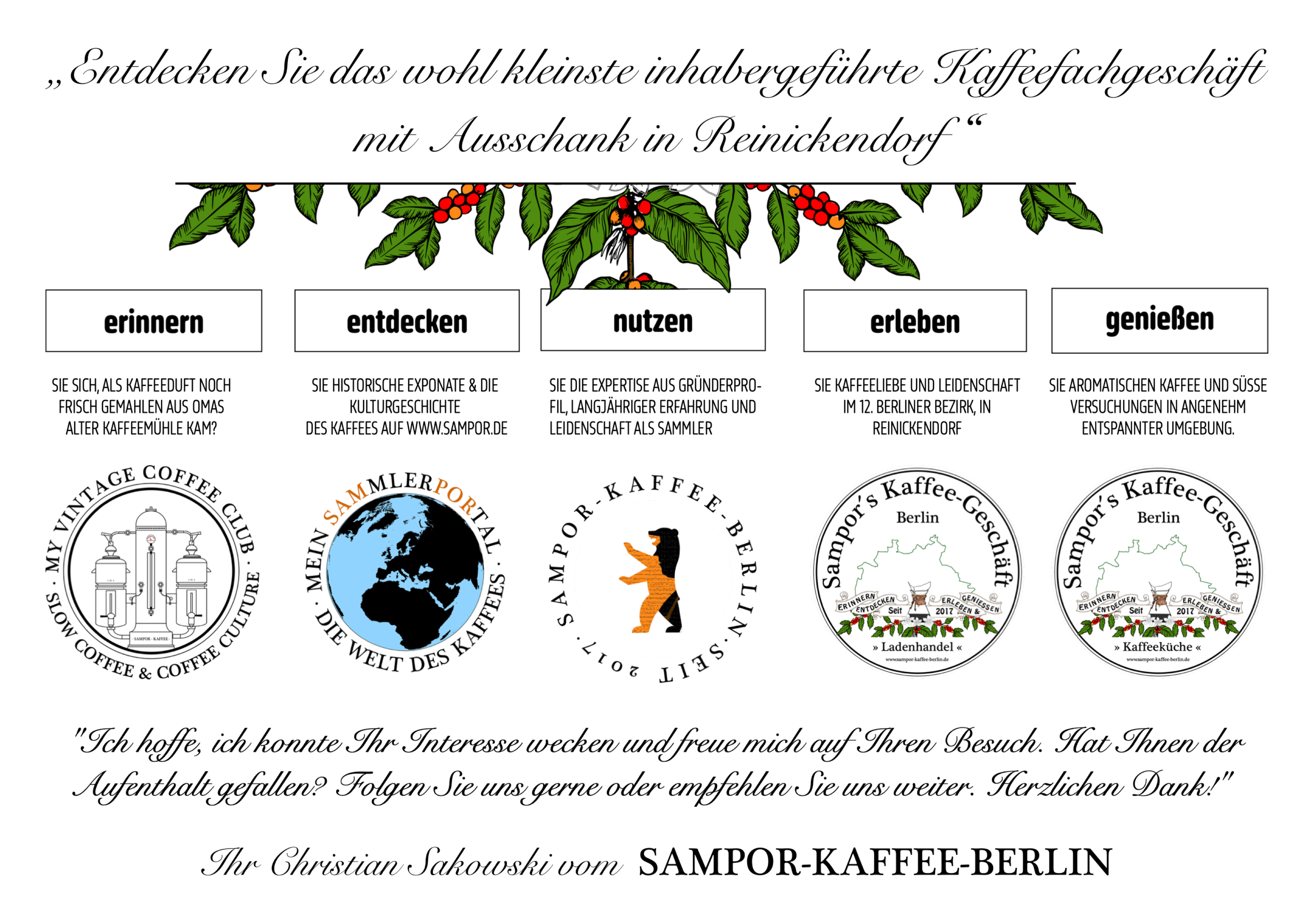 Darf ich mich vorstellen? Mein Name ist Christian Sakowski. Ich wurde in Berlin geboren, habe meine Ausbildung als Chemikant und Prüfung zum Industriemeister Fachrichtung Chemie bei einem Berliner Traditionsunternehmen absolviert. Nach fast 30 Jahren in der Entwicklung, Produktion und Verpackung führte mich der Weg in die Selbstständigkeit. Seit 2015 habe ich eine Ausbildung zum Barista & Kaffeeröster in der „BSCO“ hier in Berlin durchlaufen und erfülle mir einen langjährigen Wunsch, mit der Eröffnung des „SAMPOR-KAFFEE-BERLIN“.