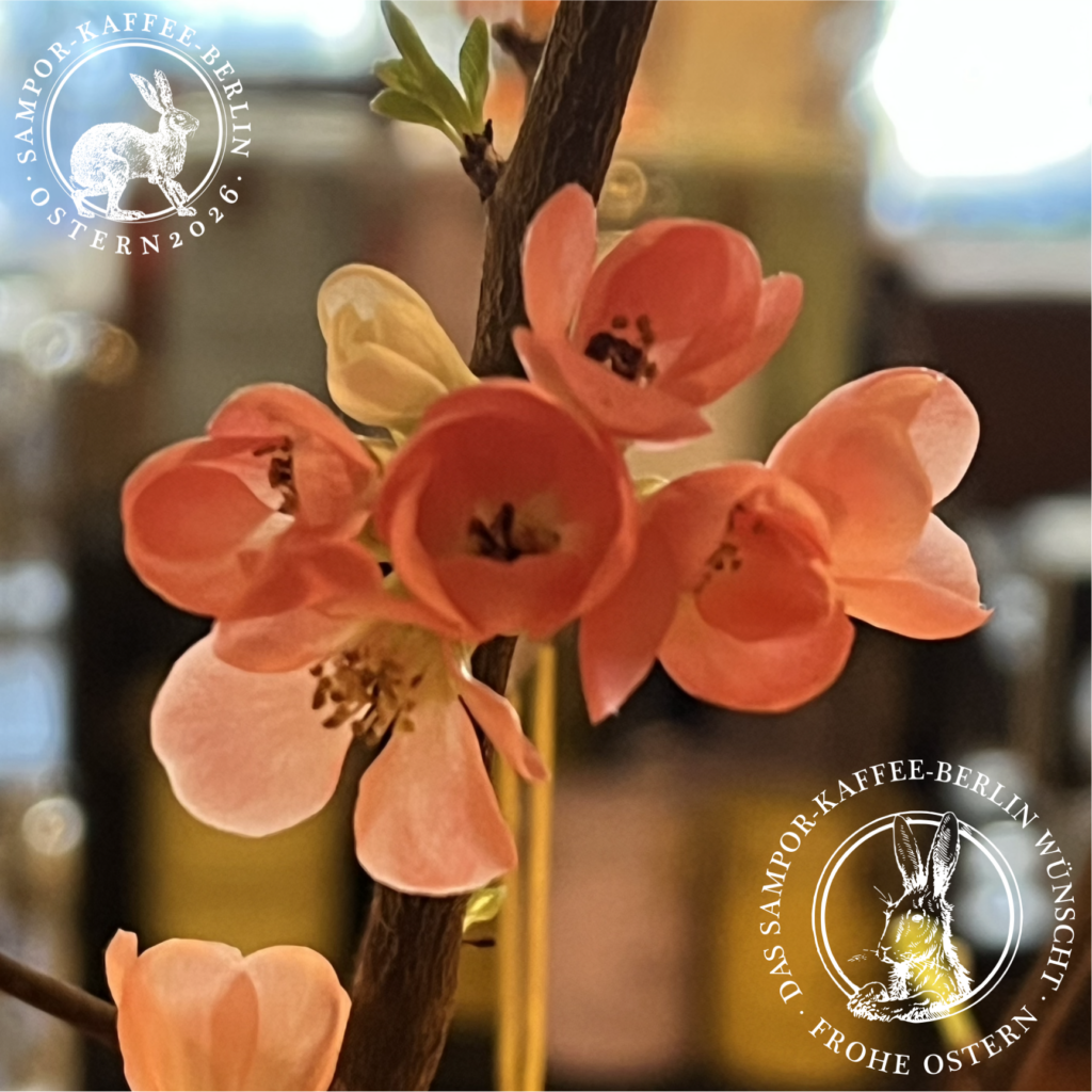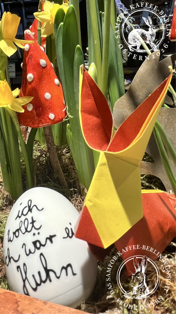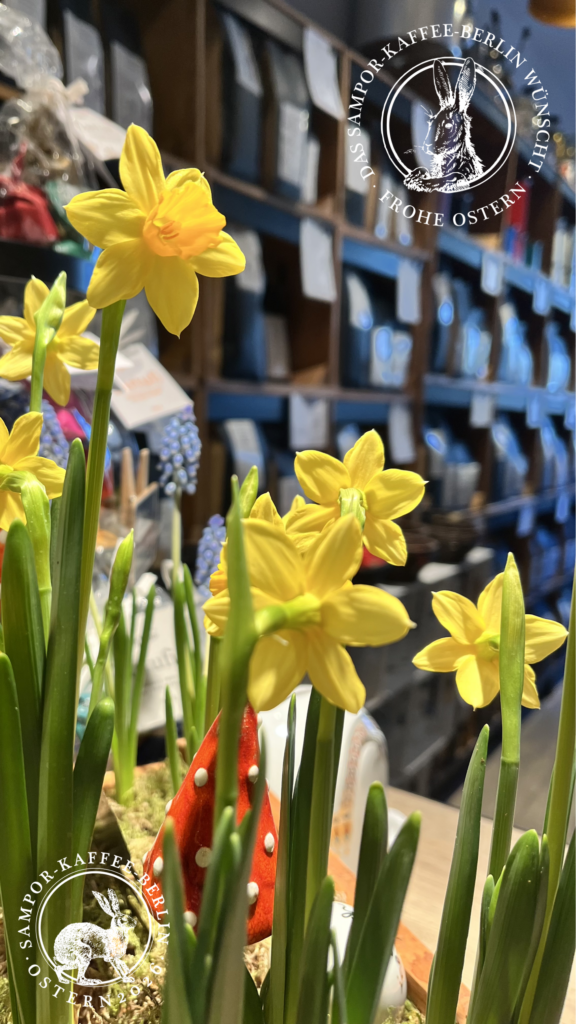 hier kommen einige Schnappschüsse aus dem mit Blumen und Oster dekorierten SAMPOR-KAFFEE-BERLIN. Ich freue mich das Mutter Natur so langsam nachzieht – schließlich war am 20.3. – Frühlingsanfang. Die Terrasse ist schon mehrere Tage geöffnet und die Tür bei den Temperaturen wieder weit geöffnet.